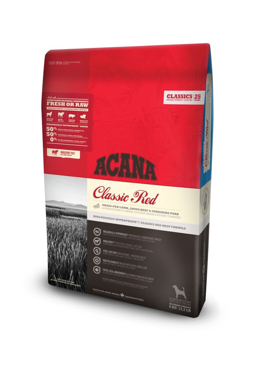 İşte tam da bu sebeple ACANA Classic Red köpeğinizi her yönüyle beslemek için hepsi de WholePrey™ oranlarında günlük TAZE veya ÇİĞ olarak teslim edilen çayırda otlamış kuzu, Angus sığırı ve Yorkshire domuzu içermektedir.
