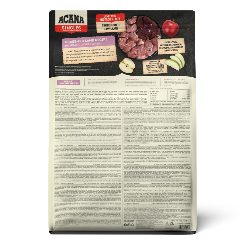 Sınırlı içeriğe sahip Acana Grass-Fed Lamb, besleyici WHOLEPREY™ oranlarında çiğ olarak gelen %50 Yeni Zelanda kuzusu içermektedir. Eklemiş olduğumuz dondurularak kurutulmuş ciğer, zor beğenenleri cezbederken, taze elma, bal kabağı ve kabak içeriklerimiz de çözülebilir lif sağlayarak hassas mideleri rahatlatıyor.