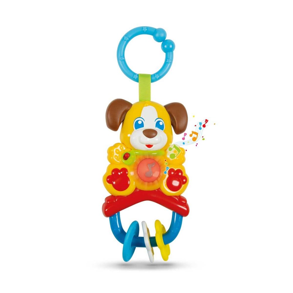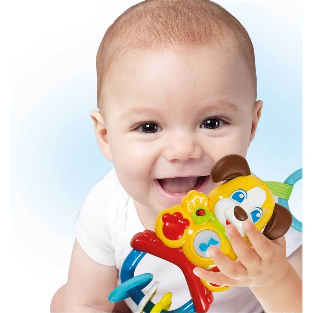 Sesli, müzikli ve titreşimli özelliği sayesinde bebeğinizin dikkatini çekecek bu sevimli köpekçik ile bebeğiniz eğlenirken aynı zamanda köpekçiğin yumuşak kulaklarıyla dişlerini kaşıyabilecek.