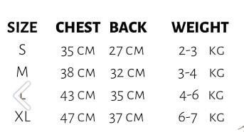 XL: 6 kg – 7 kg arasındaki köpeklere uygundur. Göğüs: 47 cm, Sırt: 37 cm. Pekinez, Pug, Shihtzu, Maltese, Pomeranian, Yorkie ve benzer ırk köpeklere uygundur.