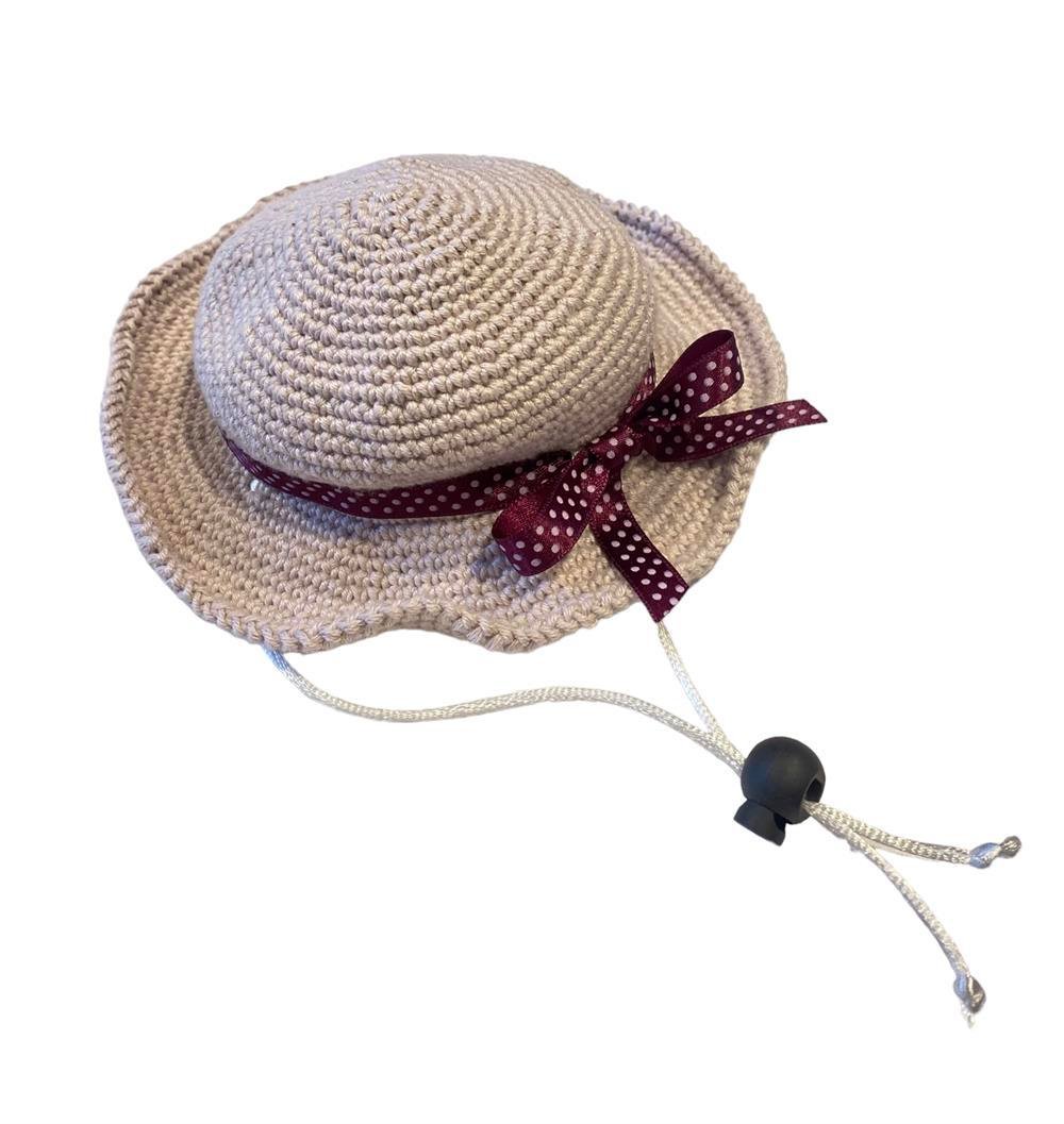 Naturel el örmesi, pamuk şapkanın dokuması, fötr koruması ve alt tarafındaki bağlama detayı ile hem tatlı hem kullanışlı.