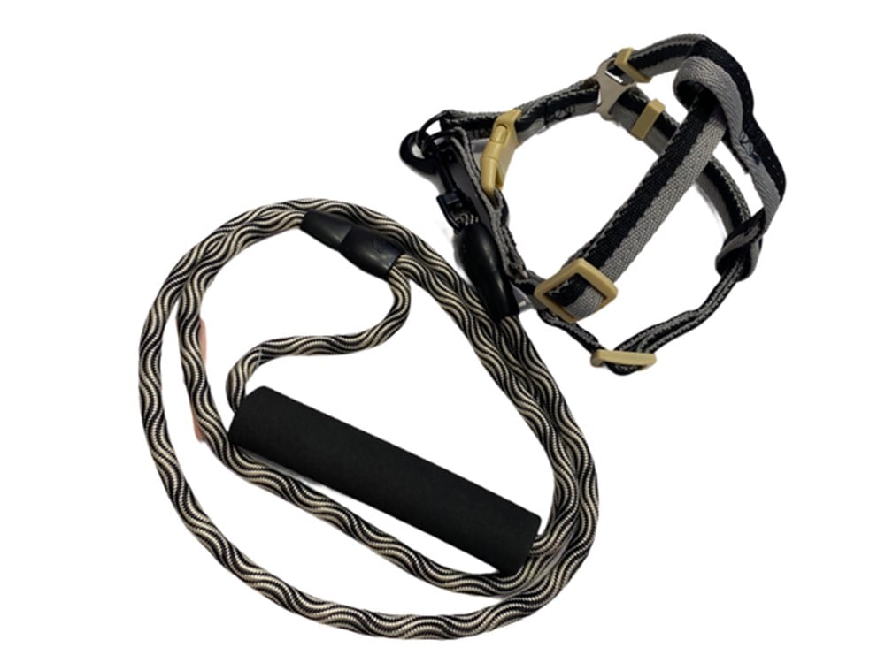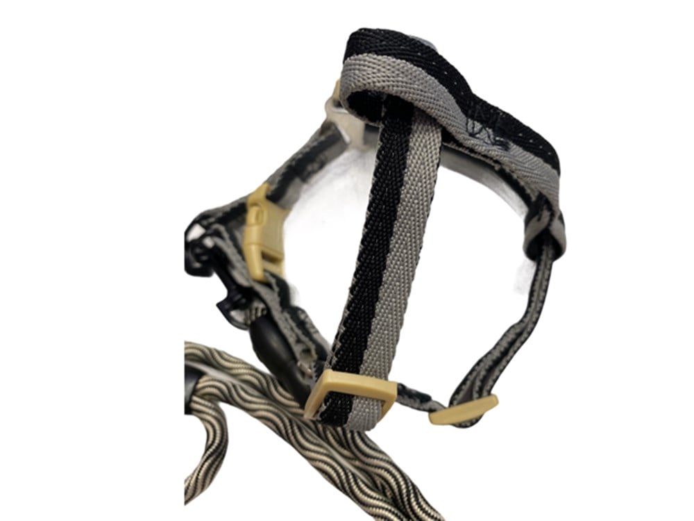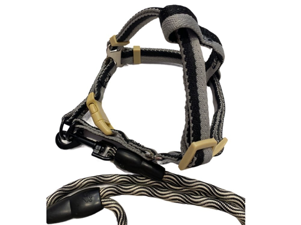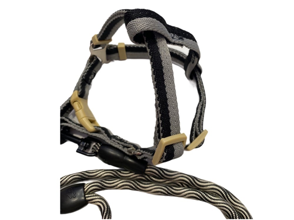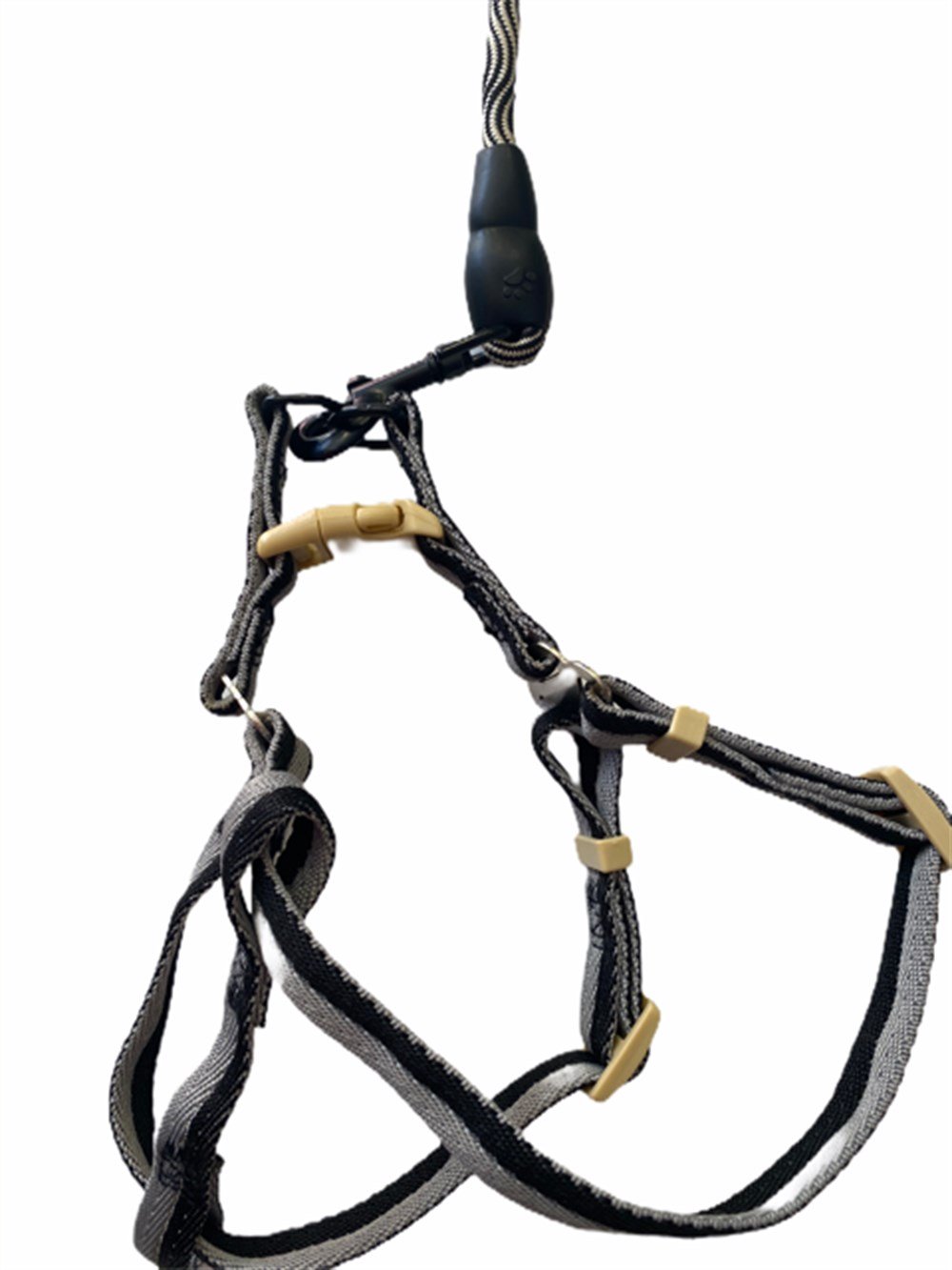 Küçük-Orta Irklar ve büyük ırk yavru köpekler için uygun, gri-siyah desenli, asil göğüs tasması ve fitil uzatma kayışı seti.