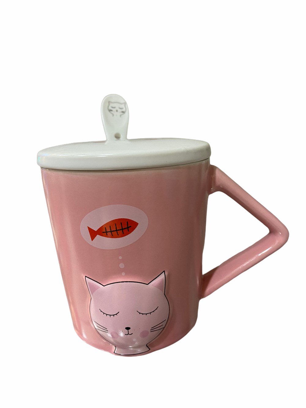 Kedi Desenli Kapaklı ve Kaşıklı Seramik Kupa Bardak Pembe