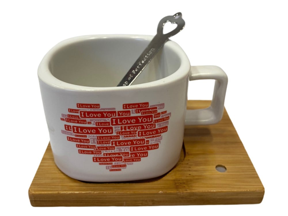Kırmızı Love Kaşıklı ve Ahşap Standlı Fincan