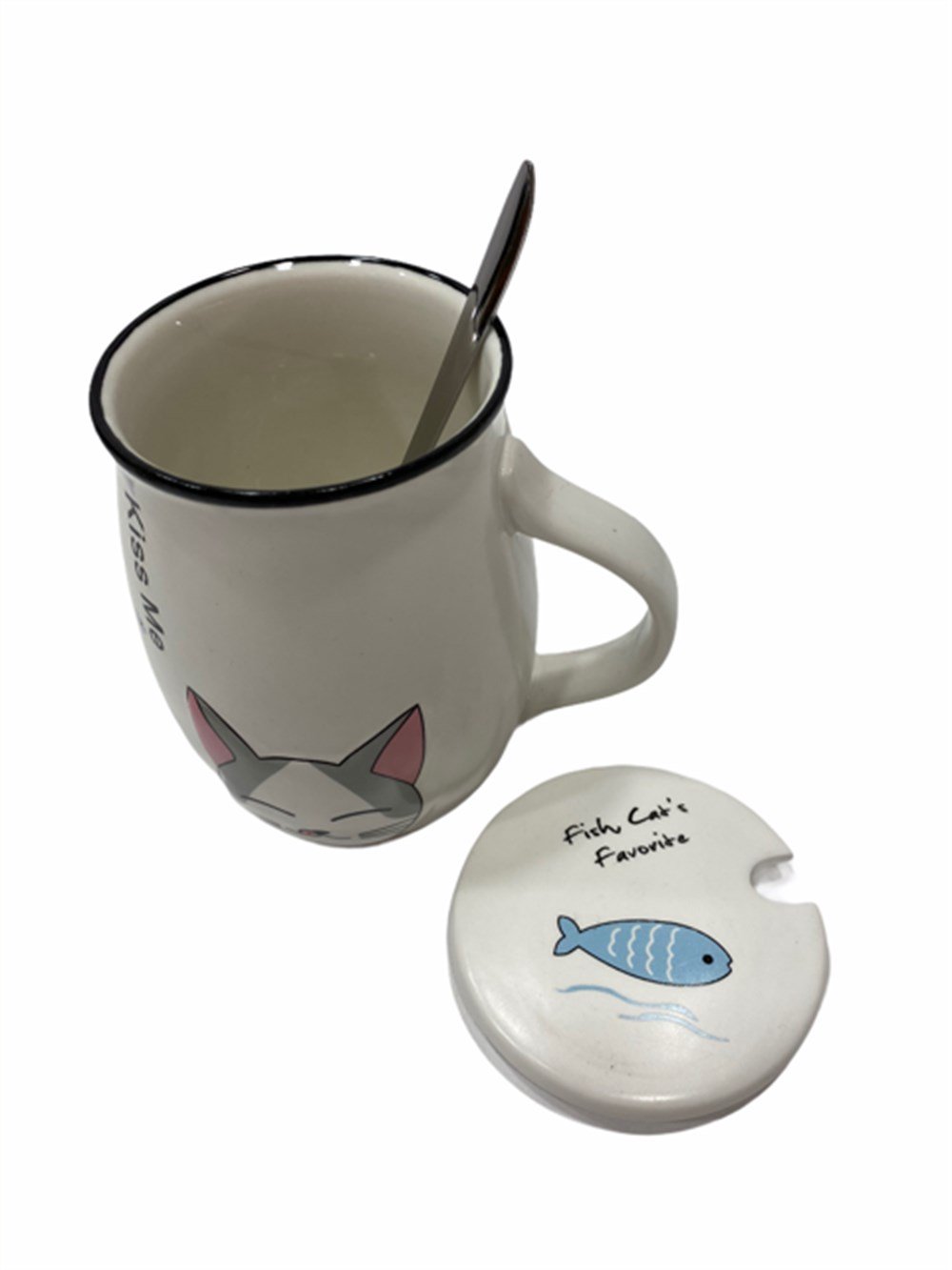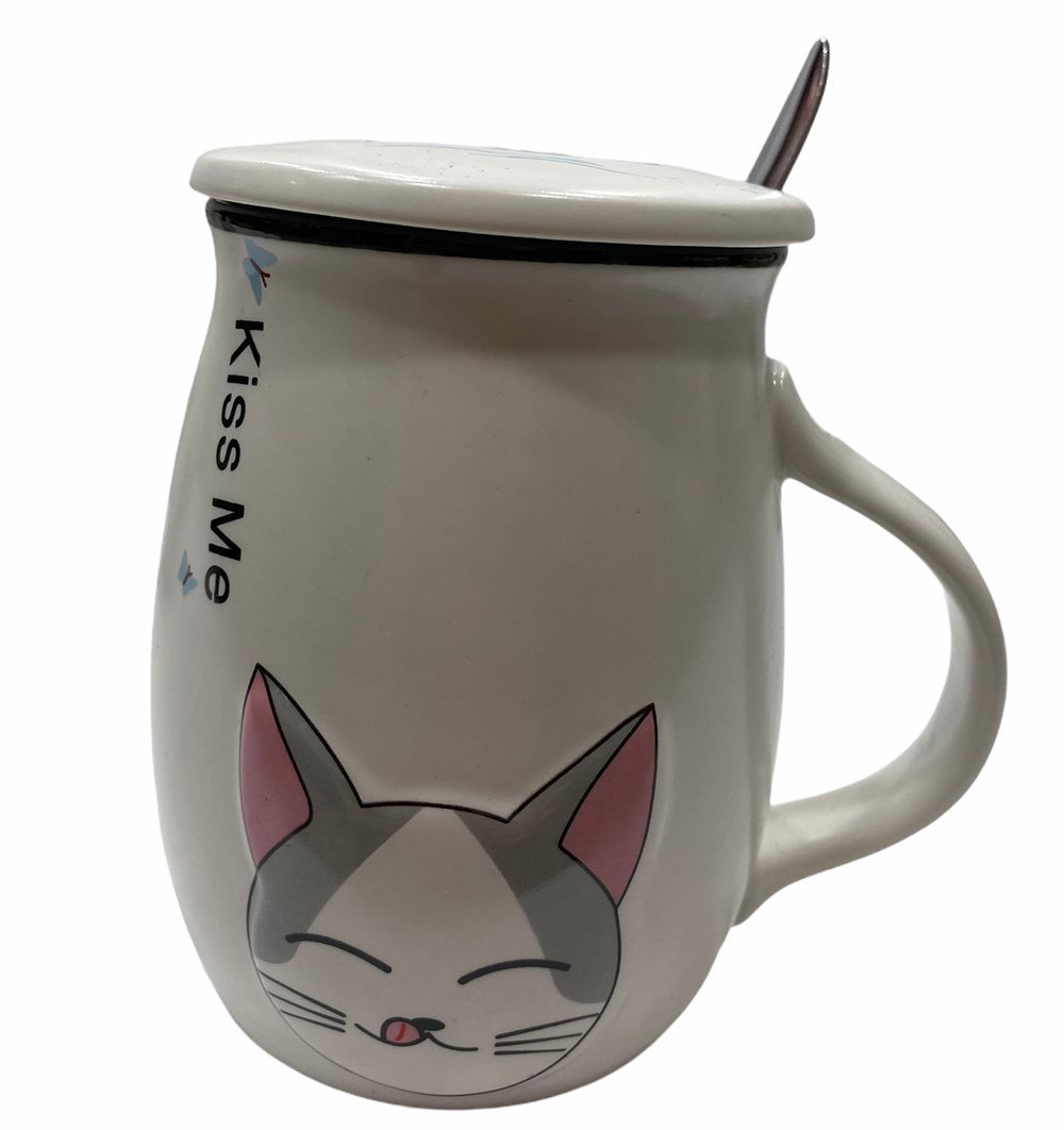 Kiss Me Yalanan Kedicik - Kapaklı, Kaşıklı Seramik Kupa Bardak