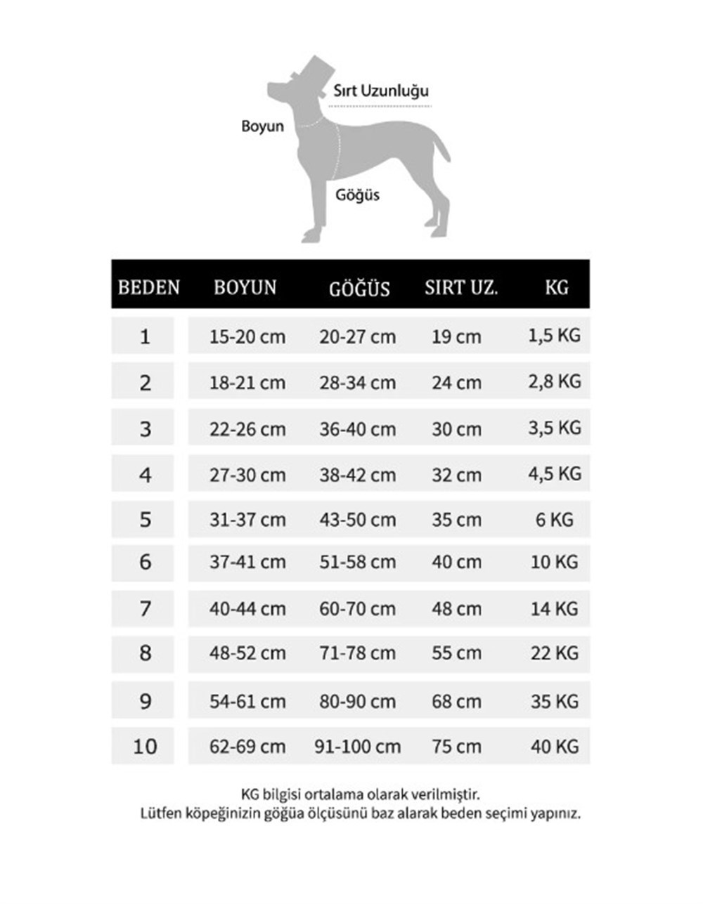 Ölçü tablosunda yer alan kilo/ırk ölçüleri tahmini olarak verilmiştir. Nasıl kendi kilomuza göre değil, beden ölçülerimize göre kıyafet alıyorsak köpeğimiz için de aynısının geçerli olduğunu unutmayalım lütfen:)
