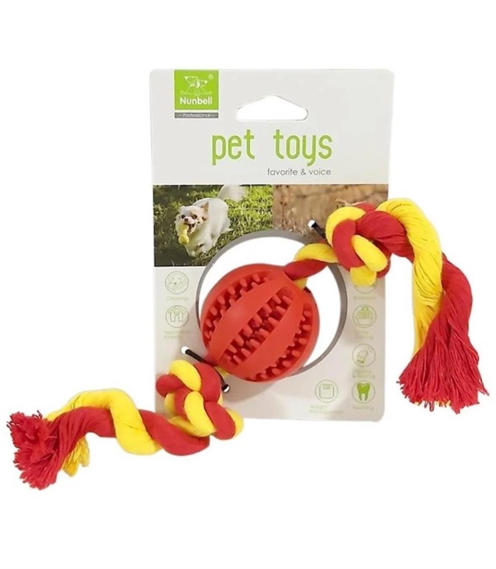 Halat çekme veya getirme oyunları için dayanıklı ve mükemmel bir köpek oyuncağıdır. Köpeğinizle oynarken ekstra kavrama sağlayan göz alıcı renklerde kordon halat halka ile ççiğnemeyi sevecekleri sağlam bir lastik top! Süper bir ikili!