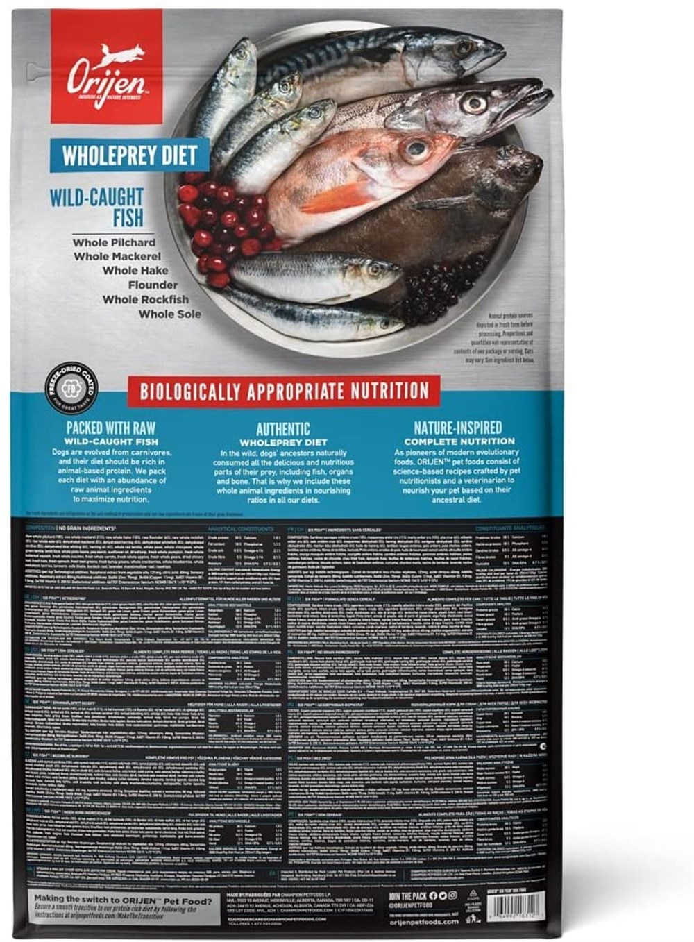Diğer hiçbir köpek mamalarına benzemeyen ORIJEN balıklarının, başlıca 6 balık içeriği dahil, 2/3’ü TAZE (soğutulmuş, koruyucu içermez) veya ÇİĞ’dir (şoklayarak dondurulmuş, koruyucu içermez).