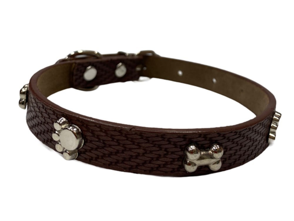 Üzerinde metal kemik ve pati süsleri olan son derece şık ve havalı bir tasma