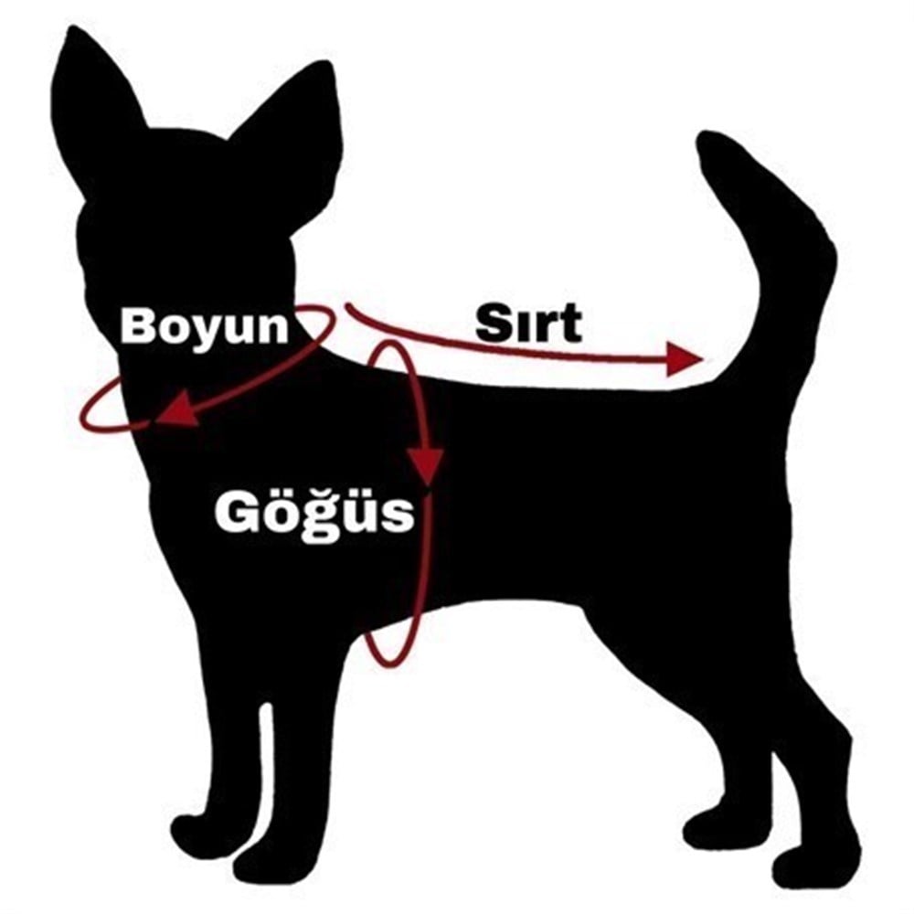 Lütfen köpeğinize uygun bedeni bulmak için köpeğinizin sırt uzunluğu ve göğüs çevresi ölçülerini alıp, kıyafet bedenine buna göre karar veriniz.