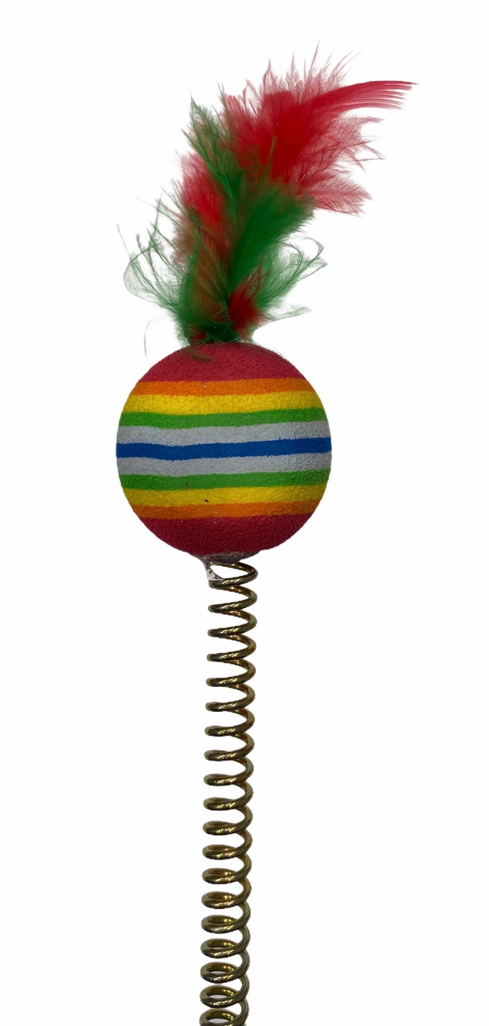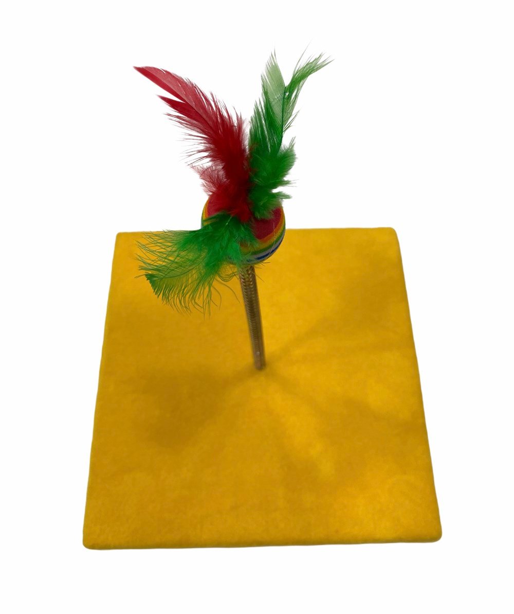 20 cm x 20 cm tabla üzerinde spiral tel üzerine takılı renkli tüylerden oluşan bu hacı yatmaz tüm kedilerin en sevdiği oyuncaklardan. O tüyler bir türlü aşağı inmiyor, kediler çıldırıyor!