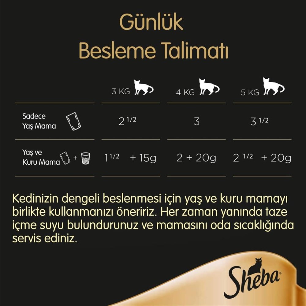 Besleme talimatı: 4kg’lık bir kedi günlük 2 ½ adet poşet yaş mamaya ihtiyaç duyar. 4kg’lık bir kedi günlük 2 adet poşet yaş mama ve 15 g kuru mamaya ihtiyaç duyar. Mama miktarını kedinizin aktivite seviyesine ve vücut kondisyonuna göre ayarlayınız. Her zaman yanında taze içme suyu bulundurunuz. Mamasını oda sıcaklığında servis ediniz, artan mamayı buzdolabinda iki güne kadar saklayabilirsiniz
