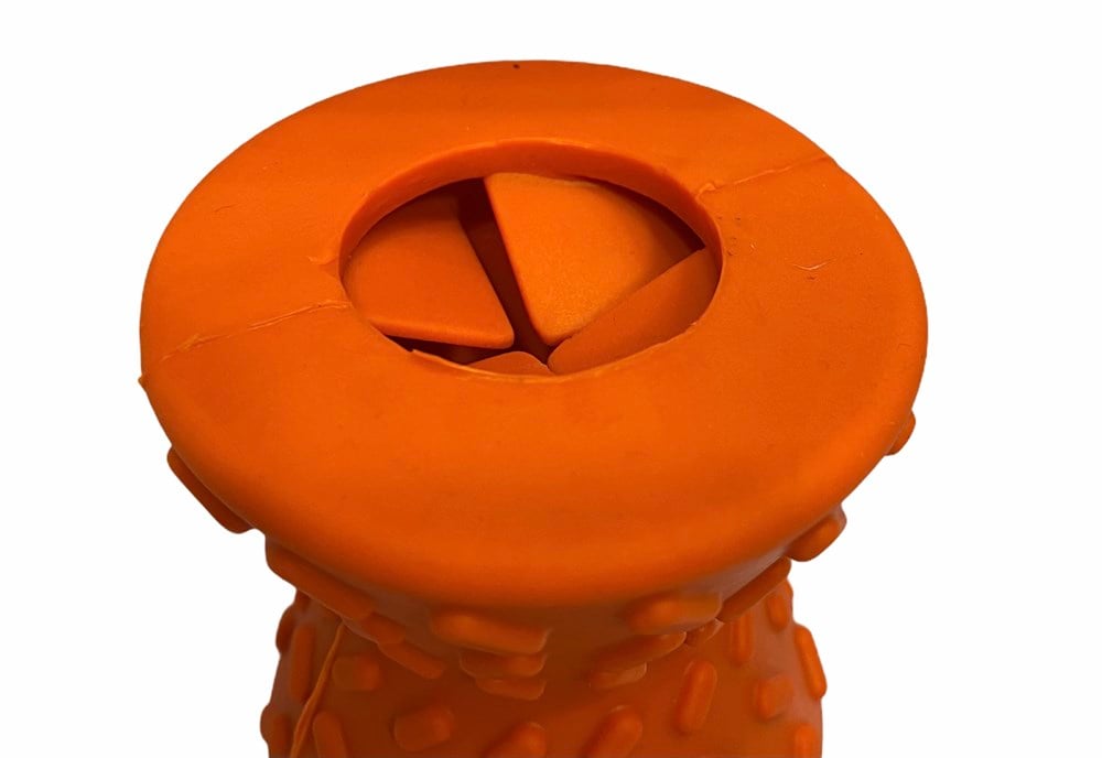 Alt ve üst taraflarındaki deliklerden kolayca oyuncağa yerleştirilebilen çiğneme kemikleri ve bisküviler gibi ödüllerle doldurarak evcil hayvanınız için daha da karşı konulmaz hale getirebilirsiniz. Köpeğiniz oyuncağı 'yakaladığında', ödülleri serbest bırakmak için onu döndürebilir.